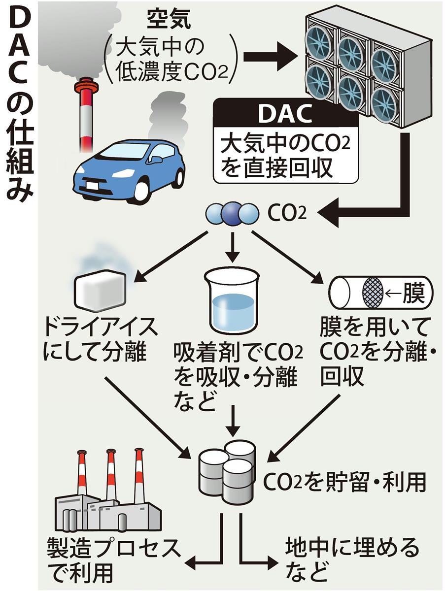 CO2の回収技術では、ほかにも火力発電所や工場などから出る濃度の高いCO2を排気管から大気に拡散する前に回収し、地中に貯留する技術「CCS」があるが、DACは排ガスよりも低濃度の大気から大量のCO2を直接回収できる利点がある。政府は将来的な脱炭素への“貢献度”が高いとみて、技術開発を後押しする。