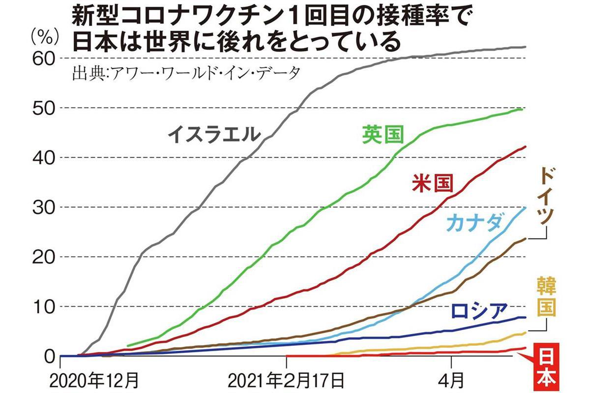 《日本での新型コロナウイルスのワクチン接種は2月17日に始まった。少なくとも1回目を接種した人が全人口に占める割合(接種率)は、4月末で約2%と先進国で最低水準だ》