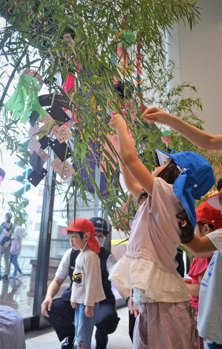 西武鉄道所沢駅(埼玉県所沢市)の南口改札内にある屋外デッキのそばに1日、使用済み切符などの鉄道廃材を活用した七夕飾りがお目見えした。この日は近くの保育園児11人が訪れ、「西武鉄道の運転手さんになりたい」「看護師さんになりたい」といった願い事が記された短冊などを飾り付けた。7日まで展示する。