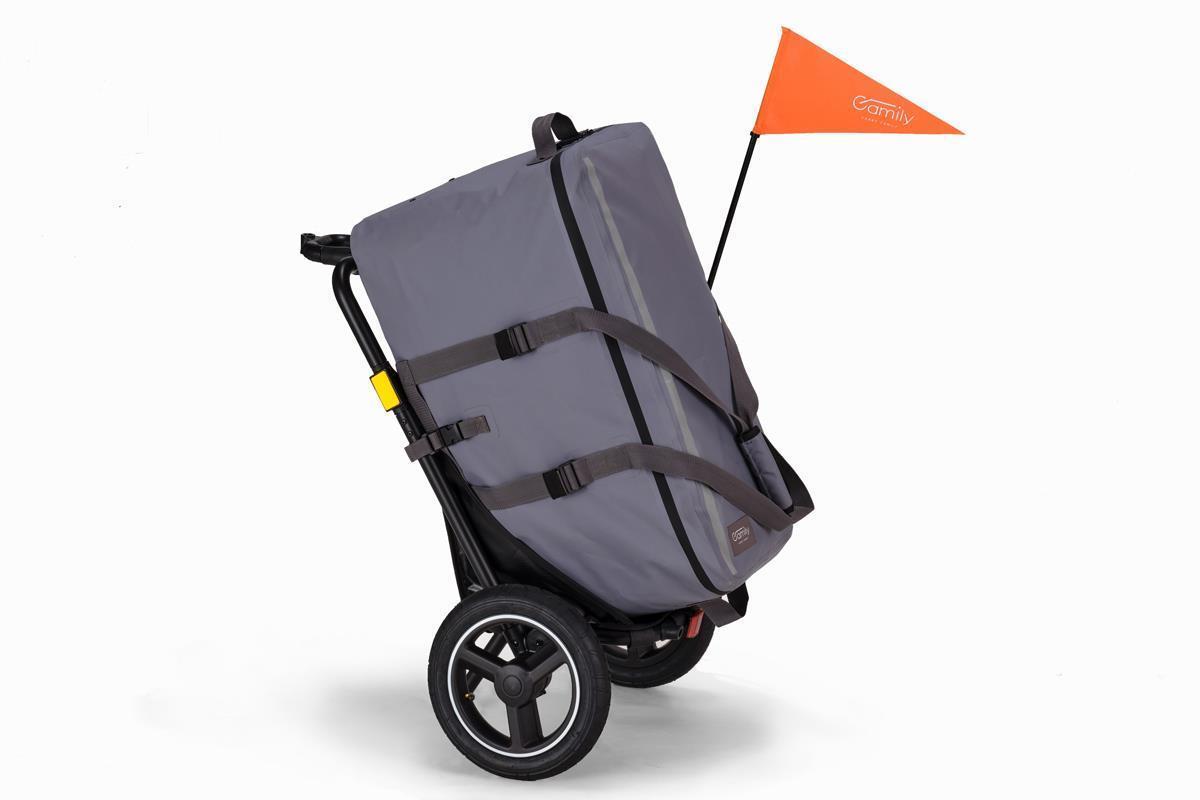 ジョイントプレートを後ろのキャリヤに固定すれば、トレーラーはワンタッチで簡単に着脱でき、単独でキャリーカートとしても使用できる。専用バッグの容量は約95リットルで、保育園や幼稚園で使用する昼寝布団2組も入るサイズ。自転車でのまとめ買いや、アウトドアシーンの荷物搬送にも役立つ。
