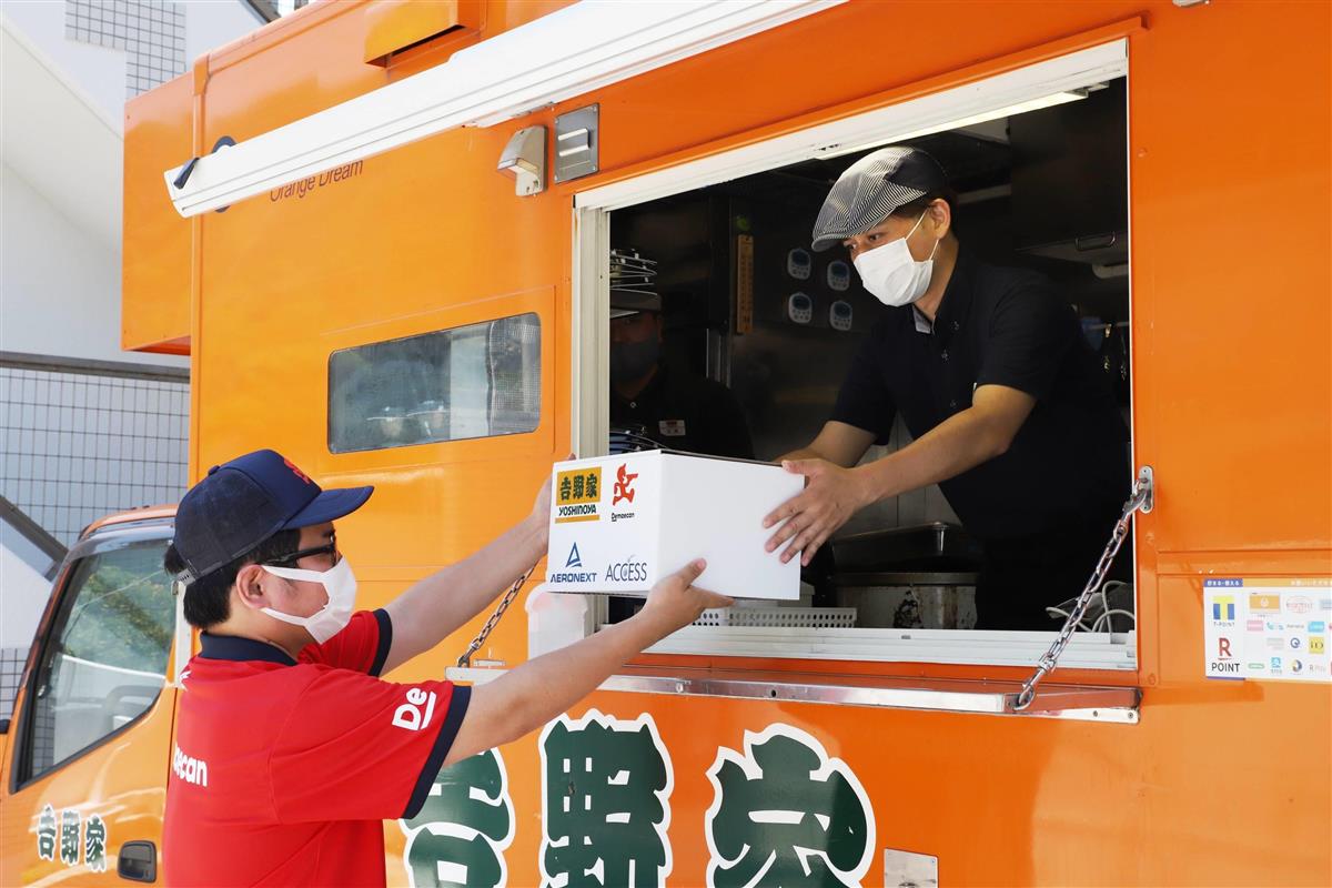 実験の工程は、市民病院のスタッフが昼食時間帯にスマートフォンのアプリで牛丼を注文▽約5キロ先で待機する吉野家のキッチンカーで牛丼を調理・箱詰め▽出前館のスタッフが約200メートル先の離陸地点(立石公園)に運び、ドローンに搭載▽公園内から離陸させ、海上・陸上を自律飛行▽病院の屋上でスタッフが受け取る-という段取り。