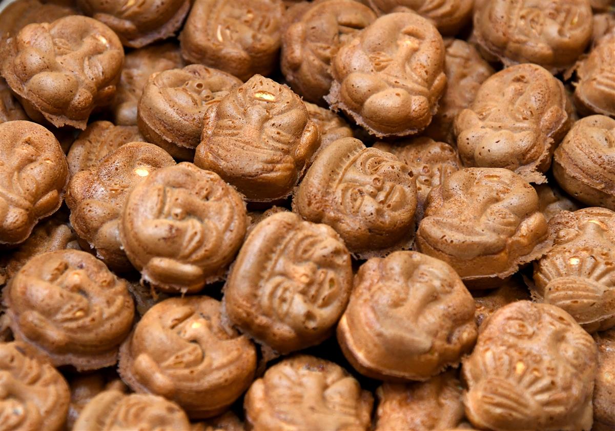 安産の御利益で知られる水天宮(同区日本橋蛎殻町)の向かいに構える重盛永信堂は、多い日には人形焼が1万個売れる。皮は薄く、あんこが多め。現代人の味覚に合わせ、甘さを1割ほど控えめにしたものの、創業時から材料と作り方は変わらず添加物や保存料は使わない。七福神をかたどっているが、モチーフは、福禄寿以外の6種類。「『7人目の神様』は買ってくださったお客さま」(重盛さん)との思いが込められているという。