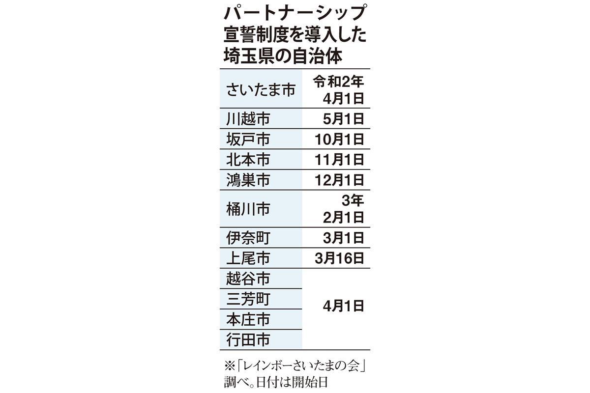 性的少数者の支援団体「レインボーさいたまの会」の5月14日時点の集計によると、埼玉県内でパートナーシップ宣誓制度を取り入れている自治体は、さいたま市、川越市など12市町に上る。大野元裕知事も、初当選した令和元年8月の知事選で性的少数者支援を主要政策の一つとして掲げており、県は相談体制などの強化を進めている。