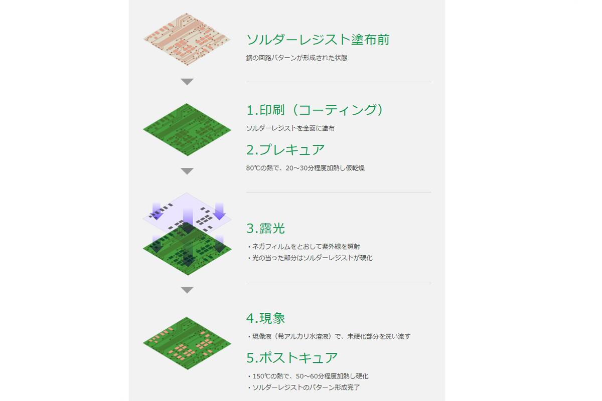 ソルダーレジストの「ソルダー」ははんだ付けを指し、「レジスト」は抵抗するという意味。部品をプリント基板に取り付ける際、緑色のインキが不必要な部分にはんだが付着するのを防ぐ役割を果たすのだ。
