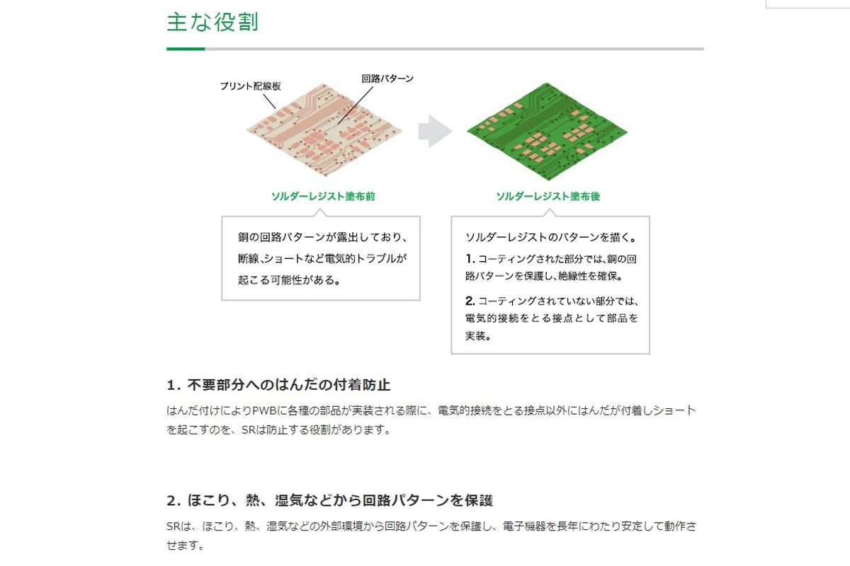 プリント基板になぜインキが使われているのか。少し専門的な話になるが、太陽ホールディングスのインキは、電子部品が取り付けられる前のプリント基板である「プリント配線板」に使われている。プリント配線板の段階では基板は緑色ではない。電気を通す銅の回路パターンが露出した状態では、断線やショートといった電気的なトラブルが生じる恐れがある。
