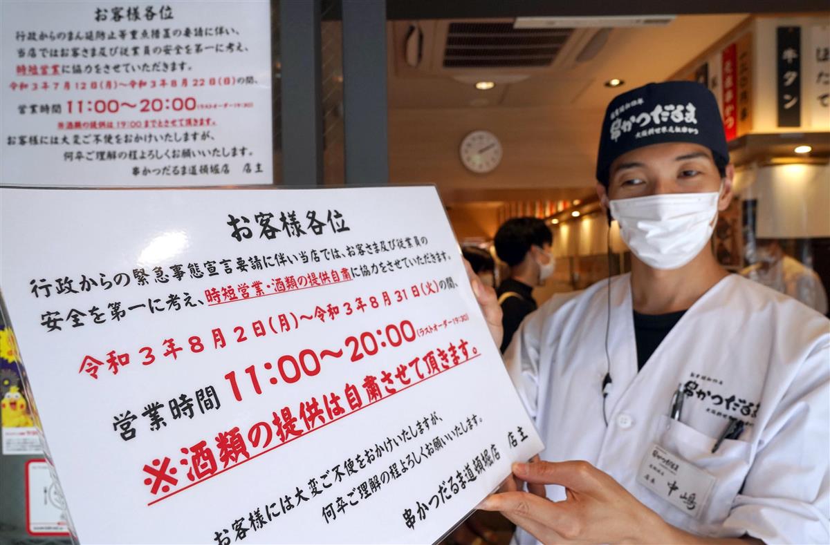 「感染者数が増えていたので(宣言が)出るかと思ってはいたが、明日から酒が提供できなくなるのはきつい」。同店の中嶋隆晴店長(38)は肩を落とす。ここ最近の売り上げは、飲食店に酒類の提供停止が要請された3度目の宣言時(4月25日~6月20日)と比べると、約1・5倍に回復していたという。