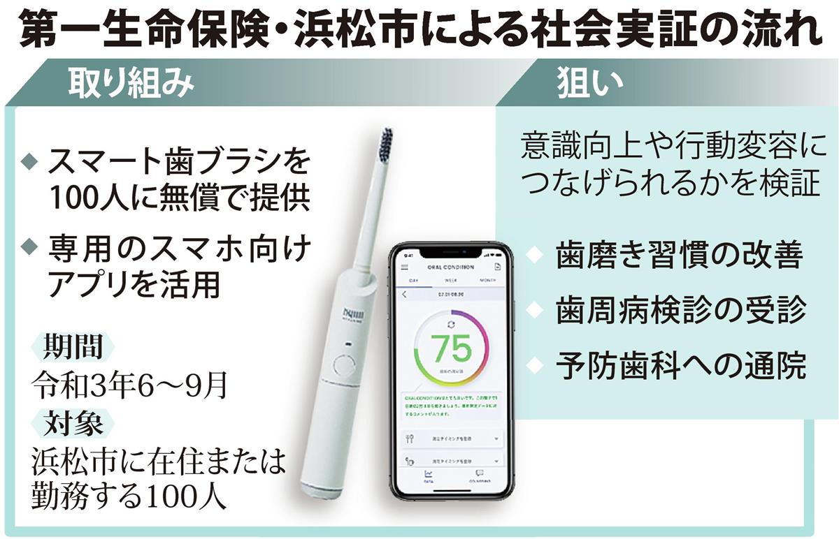 第一生命保険は6月から、歯や歯周組織などの口(こう)腔(くう)のケアに関する社会実証を浜松市と組んで始めた。浜松市に在住または勤務する100人を対象とし、口腔ケア事業などを手掛けるベンチャー企業のNOVENINE(ノーブナイン、大阪市中央区)が開発した口臭測定センサーを兼ねたスマート歯ブラシと専用のスマートフォン向けアプリを活用。口臭や、アプリを使って撮影する口腔内の写真などのデータを基に、歯磨き習慣の改善、歯周病検診の受診、予防歯科への通院といった、歯周病を防ぐための意識向上や行動変容につなげられるかを検証する。社会実証は9月まで行い、第一生命はその成果を踏まえ、健康増進や病気の予防に役立つサービスの開発を検討する。