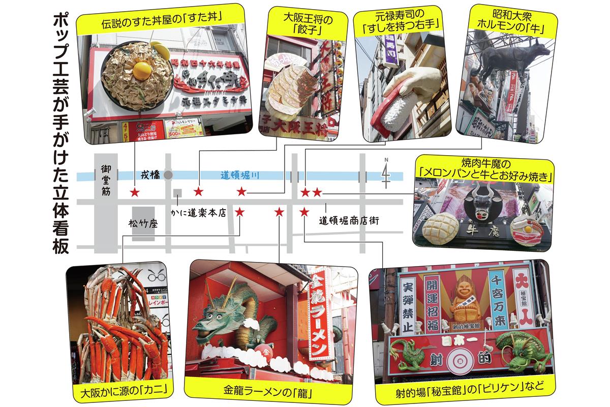 「道頓堀の立体看板の大半がポップ工芸がつくったといわれる」と自負する中村社長。道頓堀商店会にある店舗で、少なくとも8店の店頭を彩っている。今年4月、カニ料理店の「大阪かに源」前に置かれていたカニのオブジェが壊される被害があったが、「あれ(カニ)もうちので…」と明かす。