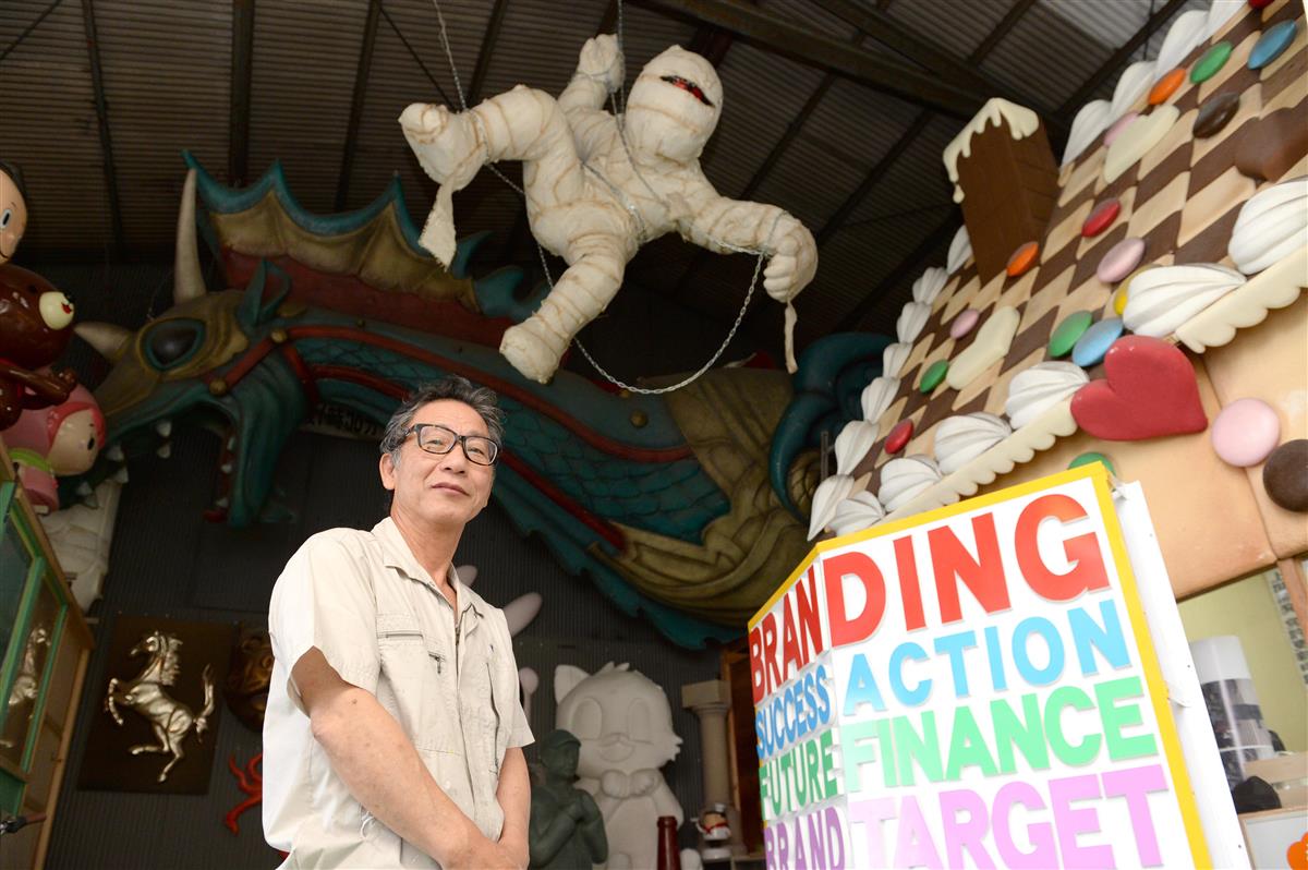 我流で立体看板の技を磨いてきたポップ工芸の中村社長。今は後進を育成、指導しながらユニークな立体看板を国内外へ送り出し続けており、年間40体前後の受注がある。奈良県のマスコットキャラクター「せんとくん」の立体像など、自治体からの発注も増えている。