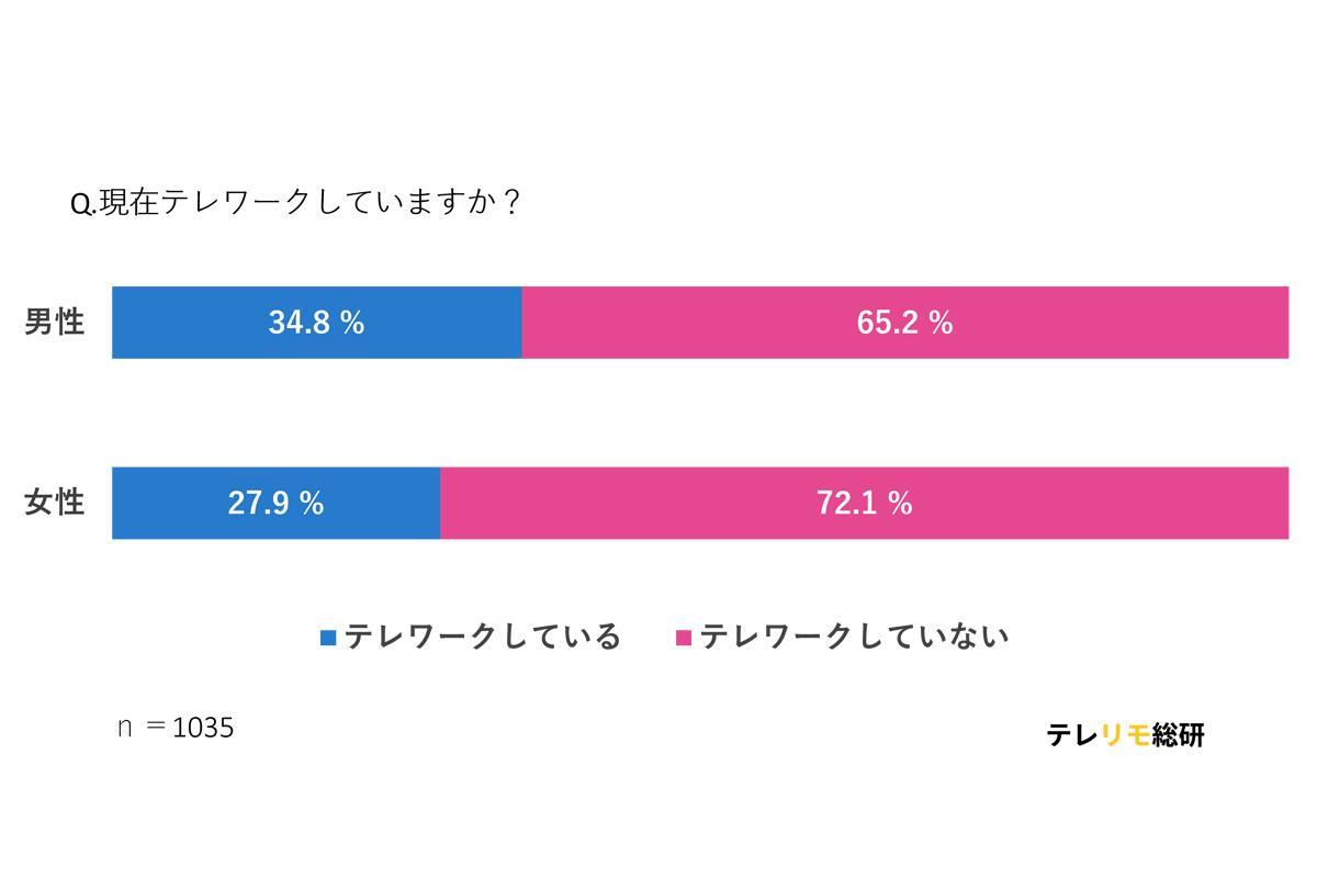 ITの力で地方創生を目指している「LASSIC」は、テレワークを経験したことがある20~65歳のビジネスパーソン1035人を対象に調査を実施。テレワークの実施率は男性で34.8%、女性で27.9%だった。全体でみると3割程度だが、東京都内の企業に限定すると、8月のテレワーク実施率は65%に達しており、日本で長年普及してこなかった在宅勤務が、コロナ禍で一気に浸透したことが分かった。