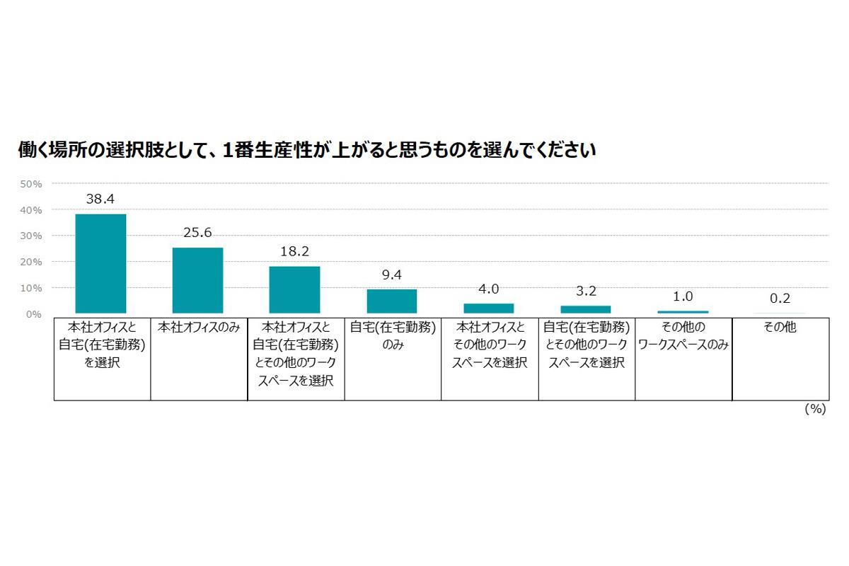 レンタルオフィスやコワーキングスペースといった「フレキシブルオフィス」を手掛ける「WeWork Japan」(東京)が一般従業員500人を対象に行った調査では、最も生産性が上がると思う働き場所について「本社オフィスと自宅を選択」するとの回答が38.4%と約4割を占めた。「いつ・どこで・どのように」働くかを自分で決めたいと答えた人は8割に上り、働き方の裁量権を会社ではなく、働き手自身が持つことへのニーズも高まっている。