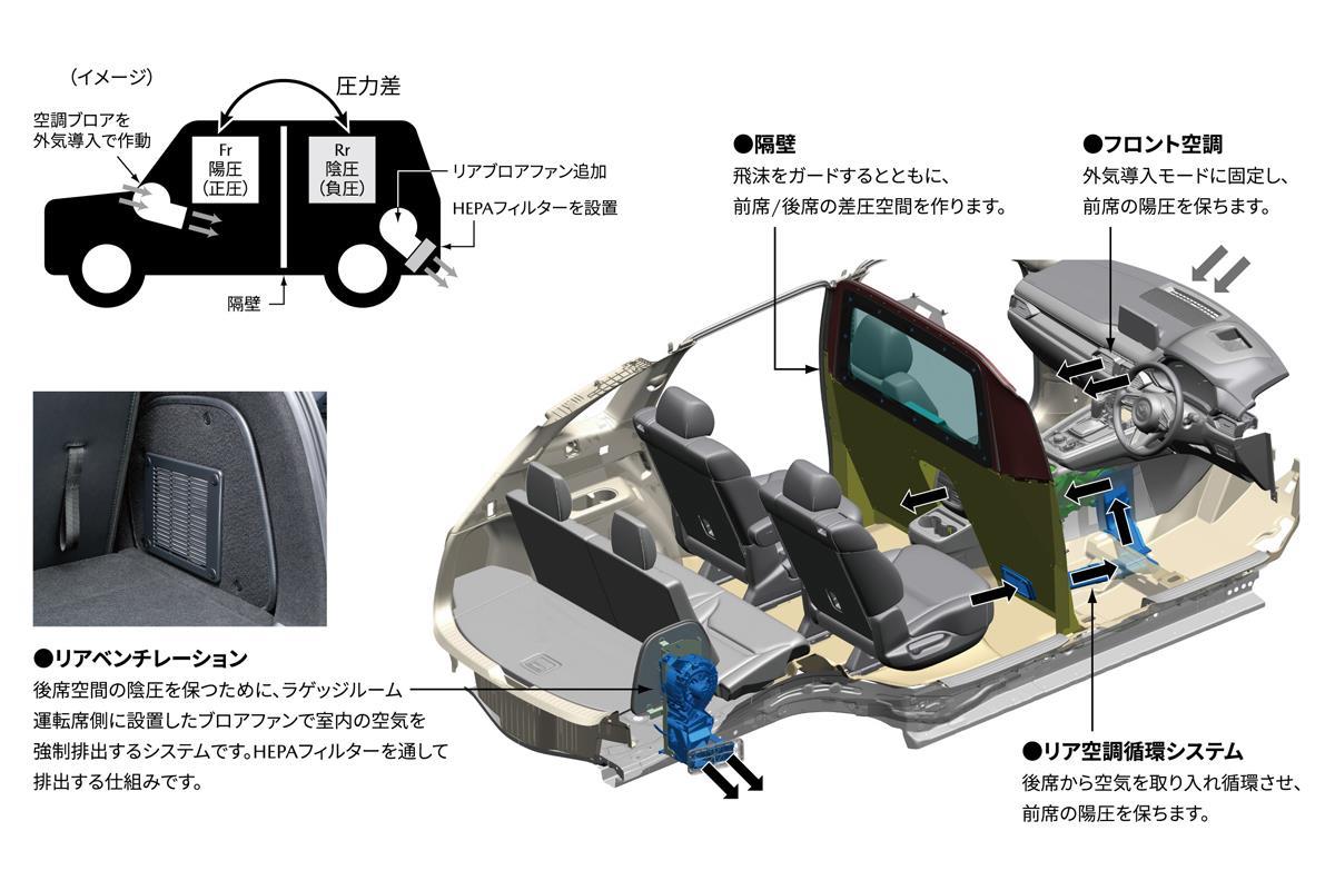 車両はマツダ最大の3列シートを備える「CX-8」である。特徴は車内の隔壁にある。くしゃみや咳などによる飛沫をガードするために、運転席と助手席のある1列目と2列目以降の後席を分離する。しかも、前席と後席に圧力差を発生させることで、後席の空気が前席に流れ込みづらい構造にしているのだ。