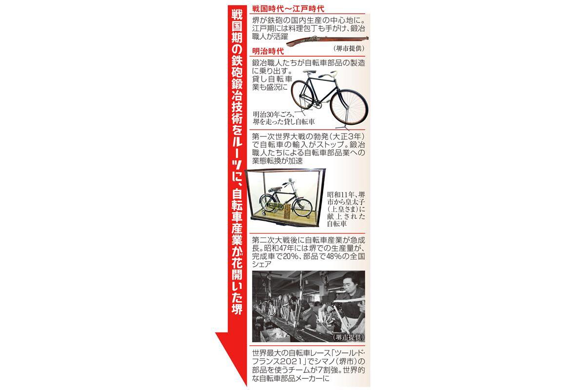 転機は大正3年の第一次世界大戦の勃発。自転車の海外輸入が止まると、それまで蓄積していた技術力をもとに国産化が進み、堺の自転車産業が花開く。