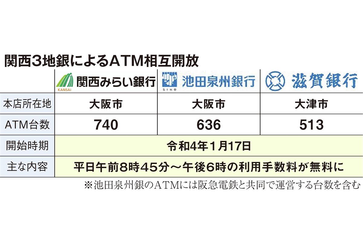 関西を地盤とする関西みらい銀行と池田泉州銀行、滋賀銀行の地方銀行3行は8日、平日昼間の時間帯でATM(現金自動預払機)の利用手数料を相互に無料にすると発表した。各行のATMを使いやすくすることで、顧客の利便性向上を図る。将来的なATM台数の削減による経費カットを見据え、ライバル関係にある3行が手を組んだ形だ。