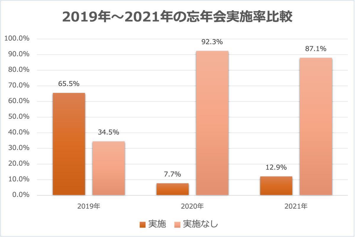 就職・転職市場の調査を行う「Job総研」を運営するライボが社会人の男女575人を対象に実施したアンケート調査によると、コロナ禍前の2019年の調査では65.5%が勤務先の忘年会を開催していたが、昨年は7.7%に激減。今年はワクチン接種も進み、感染状況もピーク時に比べ落ち着きつつあるが、それでも勤務先で忘年会を開催するとの回答はわずか12.9%だった。