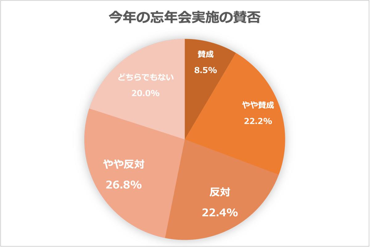 忘年会の開催についてはどう思っているのか。「賛成」(8.5%)、「やや賛成」(22.2%)と前向きな回答は全体の3割にとどまった。開催に否定的な「反対」(22.4%)、「やや反対」(26.8%)が約半数に。他方、2割の人は「どちらでもない」と答えた。