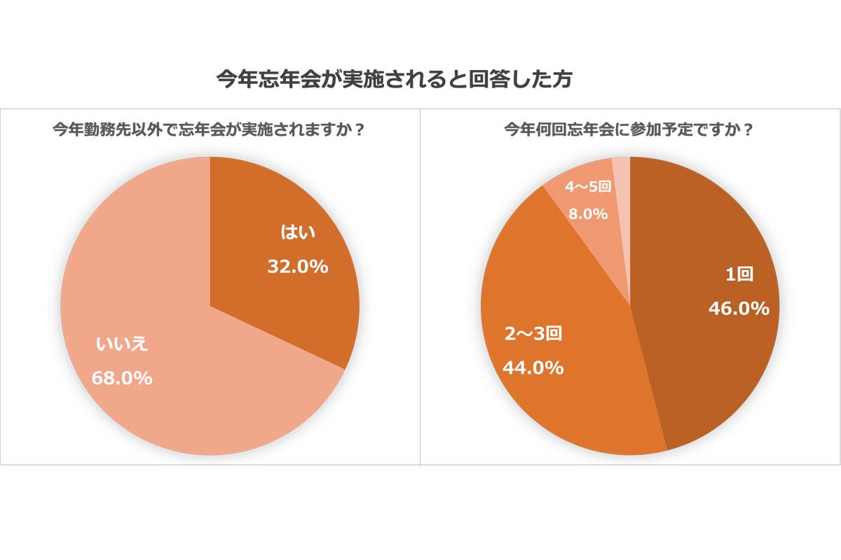 調査では大半の87.1%が「忘年会は開催されない」と回答したが、一方で「開催される」と回答した人の予定はどうなっているのか。会社以外でも忘年会に参加する予定があるか尋ねたところ、ほぼ3人に1人の32.0%が「ある」と回答。忘年会の回数は「1回のみ」が46.0%、「2~3回」が44.0%だった。中には、「4~5回」(8.0%)や「5回以上」(2.0%)と高い頻度で参加する人も。半数が飲食店での開催だった。時節柄、オンラインでの開催も4割に達した。