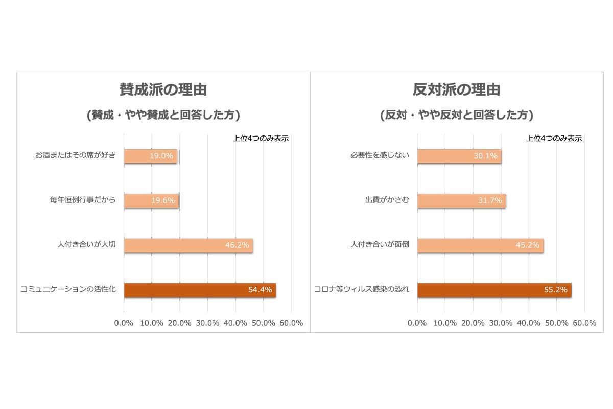 開催賛成派では「人付き合いが大切」(46.2%)という理由が半数近くに及んだが、反対派は「人付き合いが面倒」(45.2%)を理由に挙げ、奇しくも2番目に多かった回答が同じ「人付き合い」で拮抗(きっこう)した。