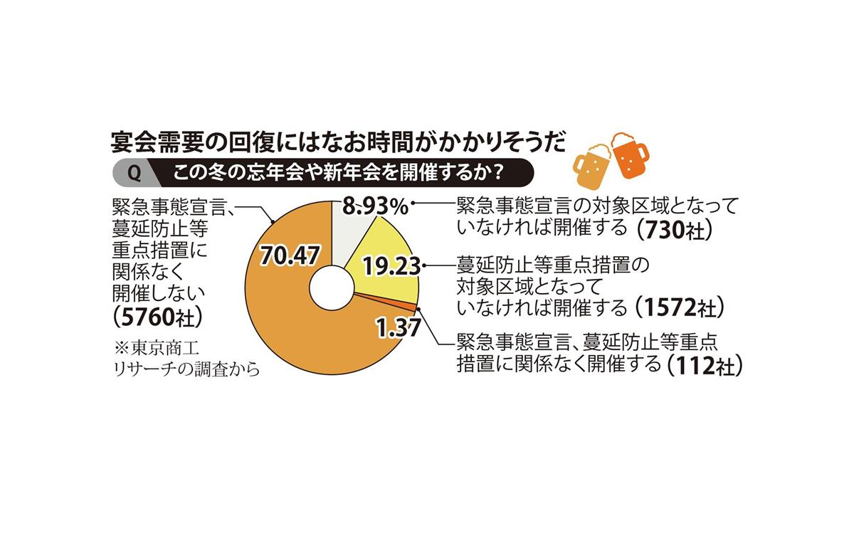 新型コロナウイルス下の行動制限緩和策が、各都道府県の手続きを経て月内にも実施される。緊急事態宣言下でも条件付きで店利用の人数制限がなくなり、外食業界からは歓迎の声が上がる。ただ居酒屋業態は生活様式の変化で宣言が明けた10月以降も客足の回復は鈍いまま。忘年会や新年会を開催しない企業が7割超に上るとの調査結果もあり、かき入れ時の年末年始も厳しい状況が続きそうだ。