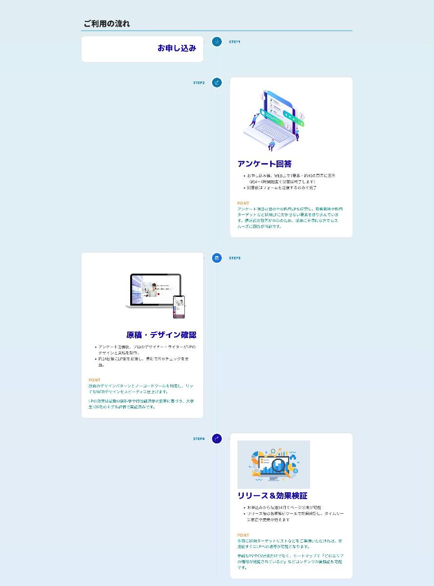 新卒採用は売り手市場が続き、LPを活用したWEBリクルーティングを展開するのが企業課題となっています。『採用LPクリエイター』はWEBアンケートを活用した制作プロセスを通じ、スピーディーに高品質の採用ランディングページがリリースできる新しい形態の制作サービスです。