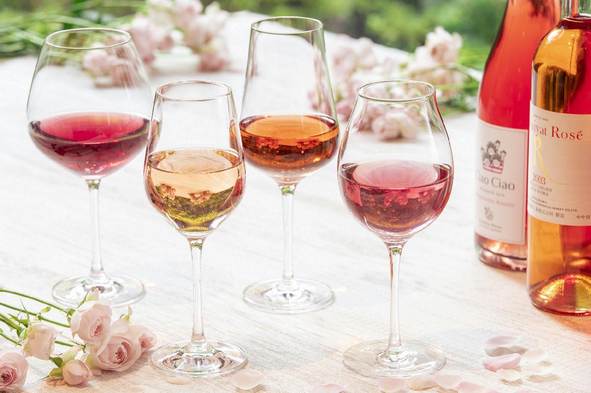 本イベントでは、山梨県と長野県のワイナリーから、10種類のロゼワインを集め、ピーマン通りのキッチンカーで提供します。例えば、濃厚な甘みと控えめな酸味で飲みやすい「くらむボンボン ピオーネ」(くらむぼんワイン/甲州市)、ドライでしっかりとした味わいの辛口のロゼワイン「ジャパンセレクト 巨峰・ピオーネ」(シャトージュン/甲州市)などです。ワインは、香りや味わいを楽しめるよう、それぞれの特徴に合わせたワイングラスに注いで提供します。例えば、辛口ですっきりとした口当たりのワインには、小ぶりで口のすぼんだ、チューリップ型のグラスを合わせます。ワインが舌先にダイレクトに届き、酸味と甘みのバランスを感じやすいのが特徴です。甘口で香りの華やかなワインには、ボウルが大きくより香りを感じやすい、ふっくらとしたブルゴーニュ型のグラスで提供します。また、ワインクーラーにはバラなどの花を浮かべ、見た目も華やかな演出をします。