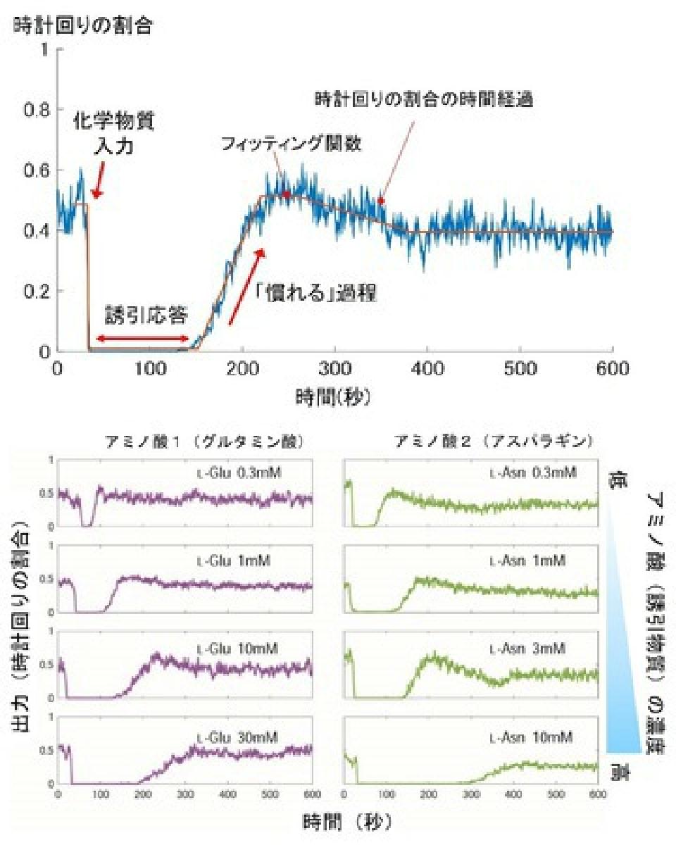 図2 化学物質入力に対するバクテリアの典型的な時間応答データ(上)と