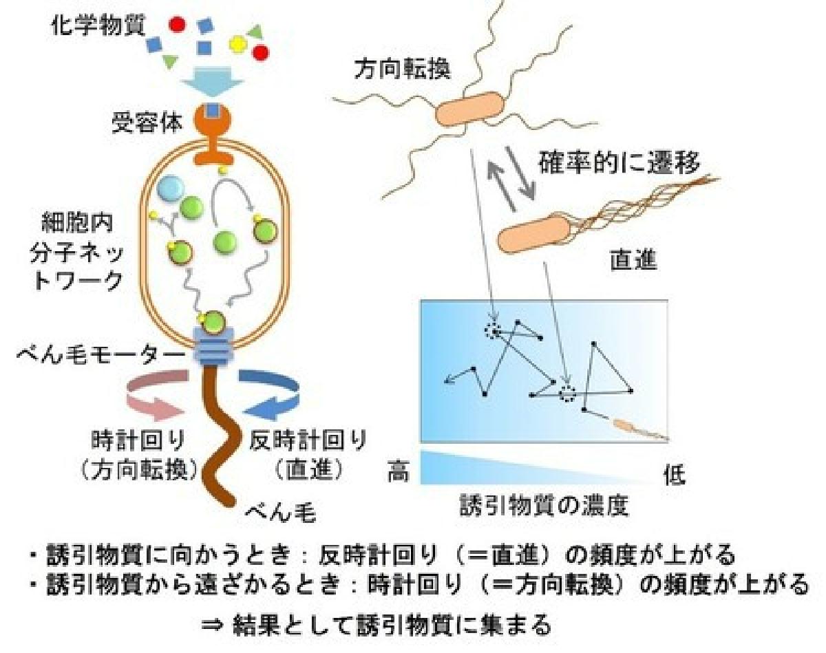 多くのバクテリアは、環境中の化学物質を認識し、バクテリアにとって好ましいもの(誘引物質)には集まり、好ましくないもの(忌避物質)からは離れる走化性という仕組みを持ちます。これは、走化性を持つバクテリアが遊泳するための運動器官「べん毛」の根元にあるモーターの回転方向が、誘引物質の場合は反時計回り、忌避物質の場合は時計回りに回転する傾向が高くなるからです。研究グループでは、走化性を持つバクテリアの代表として大腸菌を用い、べん毛モーターの回転の向きを効率よく正確に計測して定量化することに成功しました。