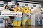 ソフトバンクモバイルの新CM発表会に出演したふなっしーと野々村真さん(右)=4日午前、東京都港区(蔵賢斗撮影)