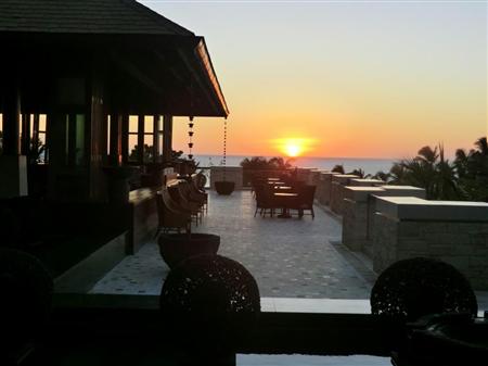 「シャングリ・ラボラカイリゾート&スパ」のロビーから沈む夕日を眺める