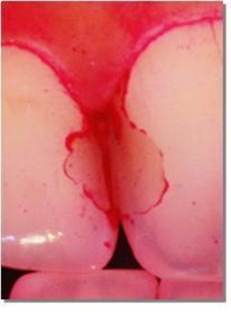 治療した虫歯の充填(じゅうてん)物と歯の境目も汚れが残りやすい。樹脂充填物周囲の歯垢(赤く染色)