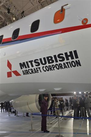 典関係者に公開されたMRJ(ミツビシリージョナルジェット)=18日午後、愛知県豊山町(甘利慈撮影)