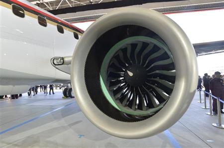 MRJの左側エンジン=18日午後、愛知県豊山町(甘利慈撮影)