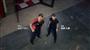ピザハット乃木坂店の上空に突然出現し、降ってきた新商品「クレイジーポケット4」をほおばる店長の西野七瀬さん(右)とクルーのムロツヨシさん