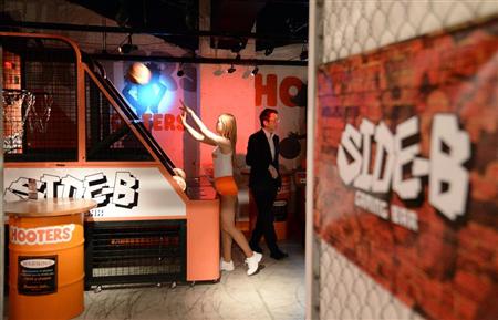 ナムコとフーターズが新業態の「ゲーミングバー・サイドビー」をオープン前に報道陣に公開した。バスケットボールゲームなど様々なゲームが楽しめる=18日午後、東京都渋谷区(鴨川一也撮影)