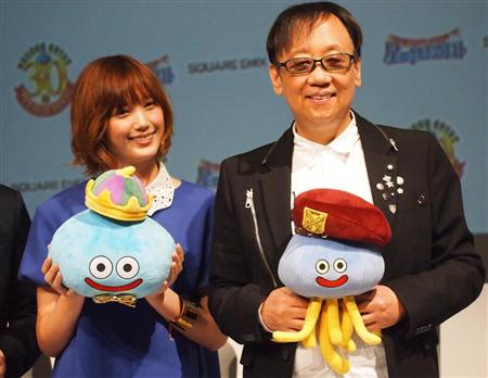 1月に開かれたドラゴンクエスト30周年イベント発表会に登場した本田翼さん(左)とゲームデザイナーの堀井雄二さん