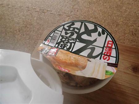 どん兵衛に熱湯を注ぐ
