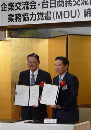 業務協力覚書(MOU)を締結した台湾三三企業交流会・台日商務交流協進会の江丙坤会長(左)と大阪商工会議所の尾崎裕会頭=3月28日