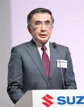 新型「スイフト」を発表するスズキの鈴木俊宏社長=27日午前、東京都千代田区(春名中撮影)