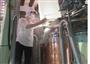 発酵タンクに移す前の麦汁を確かめる出口ヘッドブルワー。麦汁の色が赤い!