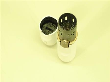 分解したアイコスのホルダー。突き出した加熱ブレード(右)が見える。何本も吸ったためカスが溜まっている