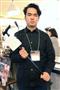小型ウエアラブルカメラを眼鏡の柄に装着、ウインクして撮影の実演をする「BLINCAM(ブリンカム)」の高瀬昇太社長