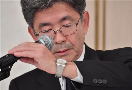 データ改ざん問題の会見で、説明をする梅原尚人副社長=20日午後、東京都港区(宮崎瑞穂撮影)