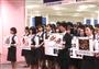お中元商戦に向けた決起集会で気勢をあげる京成百貨店の社員たち=7日午前、水戸市泉町