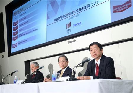 日本取引所グループと東京商品取引所が経営統合に合意。会見する(左から)大阪取引所の山道裕己社長、日本取引所グループの清田瞭CEO、東京商品取引所の浜田隆道社長=28日午後、東京都中央区