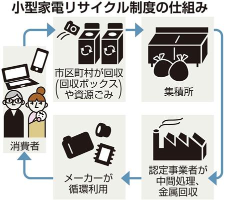 携帯電話やパソコンなど小型家電をリサイクルする新たな制度が4月1日から始まる。従来の家電リサイクル法で回収が義務づけられているエアコンやテレビなど4品目以外を対象に、市区町村が消費者から回収し貴金属などを取り出してメーカーが再利用する仕組みだ。