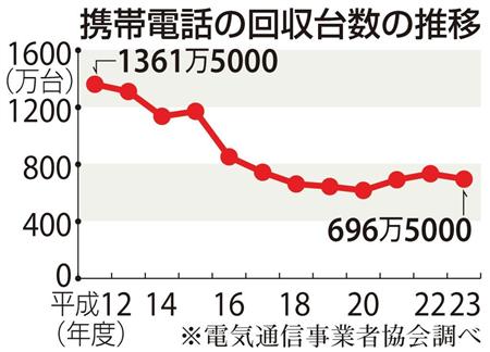 携帯電話会社などが回収を進めるが、平成12年度の1361万台から減少傾向で23年度は696万台。業界団体の電気通信事業者協会は「個人情報や写真などが保存されている上、高機能なスマートフォンはカメラやゲーム機などとしても使われ、消費者が手放したがらない」と分析する。