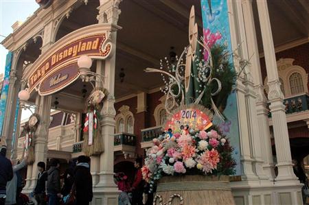 1日、千葉県浦安市舞浜の東京ディズニーリゾートで、羽織はかま姿のミッキーマウス、振り袖姿のミニーマウスが平成26年「午年」の幕開けを入園者と祝った。
