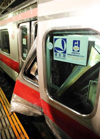 東急東横線の元住吉駅で追突事故が発生し破損した車両=15日午前、川崎市の元住吉駅(宮崎裕士撮影)【拡大】