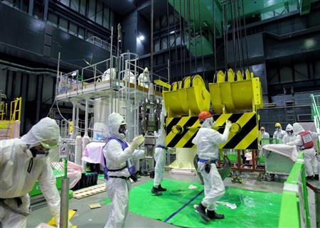 注意喚起を促す標語が至るところに張り出される中、作業員らは「UFOキャッチャー」としばしばたとえられるクレーンなどを操作して、燃料を収容する「キャスク」の除染作業に真剣に取り組んでいた。4号機で取り出しが完了した燃料は660体。今年末までに取り出し完了を目指す。