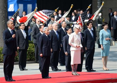 国賓として来日したオバマ米大統領の歓迎行事が24日午前、皇居・宮殿東庭であり、天皇、皇后両陛下、皇太子さまが迎えられた。安倍晋三首相ら三権の長、閣僚らも出席。両陛下がオバマ大統領と会われるのは平成21年以来、2回目。